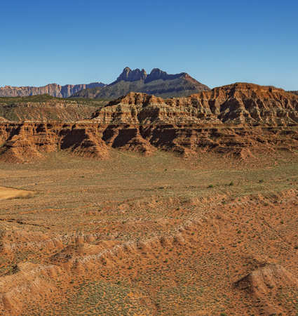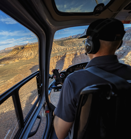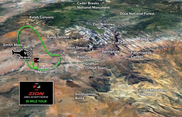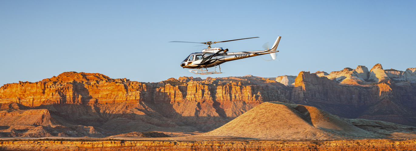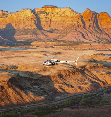 Our 35 mile Zion National Park helicopter flight ventures north between Smith Mesa and Zion National Park on your way to seeing the dark red rock figures of Kolob Canyons after circling Red Butte Mountain!