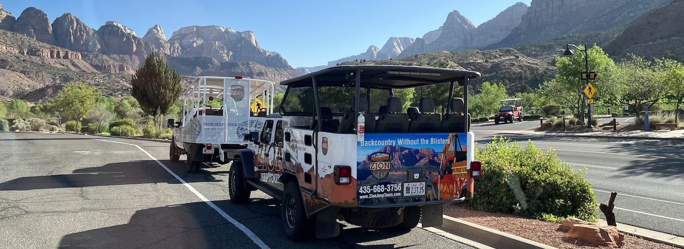 Jeep: A complete 180 degrees from life's average moments. Experience one of our customized off-road Jeep vehicles that seat from 3 to 11 passengers. Depart on your adventure south of Zion Canyon. Take in sights of the incredible mesas and buttes surrounding the park. Next up we begin to climb up towards a flat section of the formation.